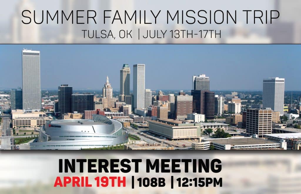 Join us for a meaningful and fun week serving at Eastwood Baptist Church in Tulsa! This trip is perfect for families and individuals—no teaching experience required. We’ll spend the week helping with Vacation Bible School, connecting with the community through canvassing and prayer walking, and wrapping it all up with a fun group activity. This is a great first mission trip or an easy way for families to serve together. Join us on April 19th, following the 11:00 service in room 108B, for an interest meeting. Contact Christian Lloyd for more information: Clloyd@fbcedmond.org